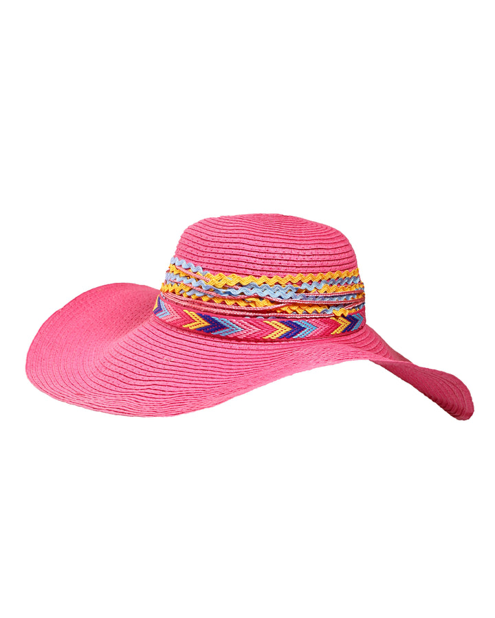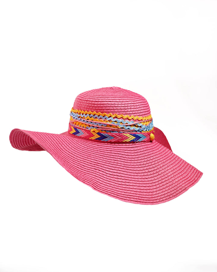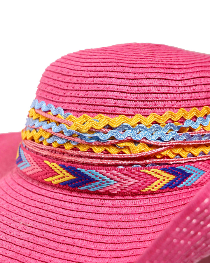 This charming pink straw hat, from the Zic Zac collection, is perfect for sunny days. It features a wide brim and a decorative band around the crown, adorned with a variety of colorful laces in a zig-zag pattern. The playful design and vibrant pink hue make it an ideal accessory for the beach and a perfect complement to pinkish outfits.